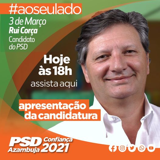 Com o lema #sempreaoseulado, o ainda vereador Rui Corça, fará hoje pelas 18 horas a sua apresentação como candidato a Presidente da Câmara Municipal de Azambuja, pelo PSD.