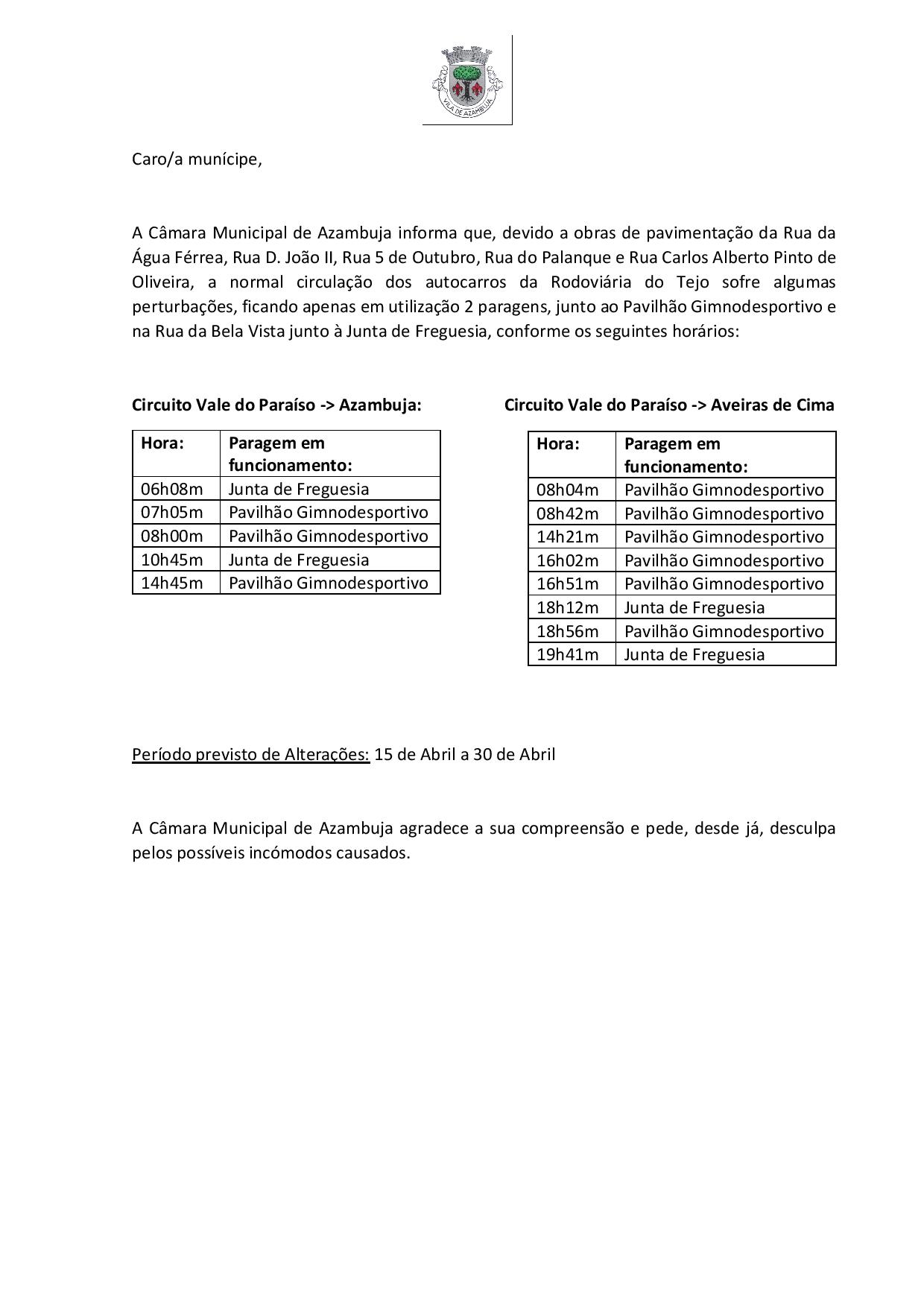 Câmara Municipal de Azambuja informa que, devido a obras de repavimentação na Freguesia de Vale do Paraíso, haverá constrangimentos à circulação automóvel e de transporte de passageiros, no período previsto Continuar a ler