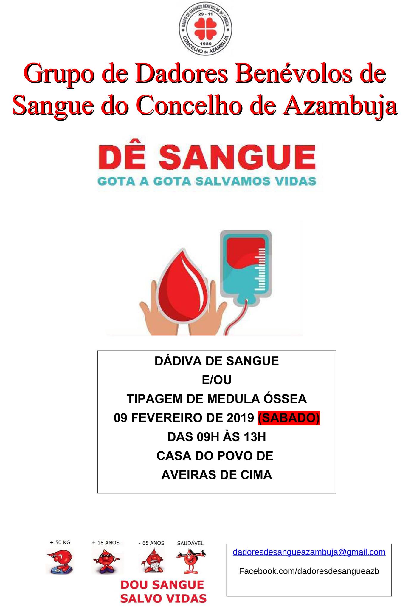 O Grupo de Dadores Benévolos de Sangue do Concelho de Azambuja vai realizar uma recolha de sangue nos dias 9 e 10 de fevereiro, na Casa do Povo de Aveiras de Cima e na Junta de Freguesia de Vila Nova da Rainha, respetivamente.