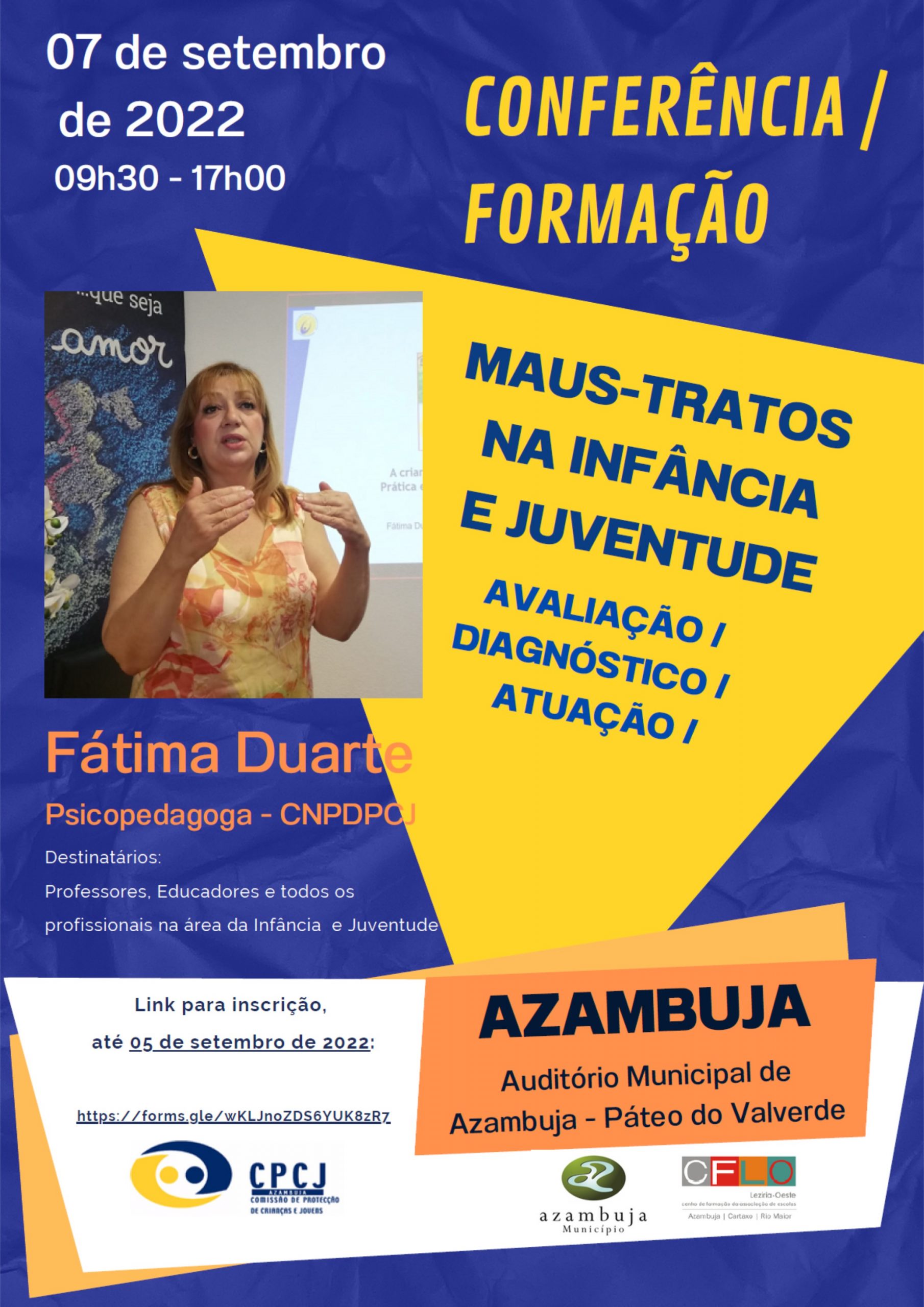 A Comissão de Proteção de Crianças e Jovens (CPCJ) de Azambuja vai promover, no próximo dia 07 de setembro, no Auditório do Páteo Valverde, entre as 09h30 e as 17h00, uma conferência/formação subordinada ao tema “Maus-Tratos na Infância e Juventude”. O evento destina-se aos profissionais desta área e contará com a intervenção da psicopedagoga Fátima Duarte, da Comissão Nacional de Promoção dos Direitos e Proteção das Crianças e Jovens (CNPDPCJ).