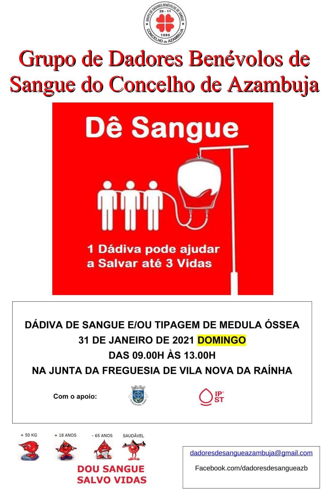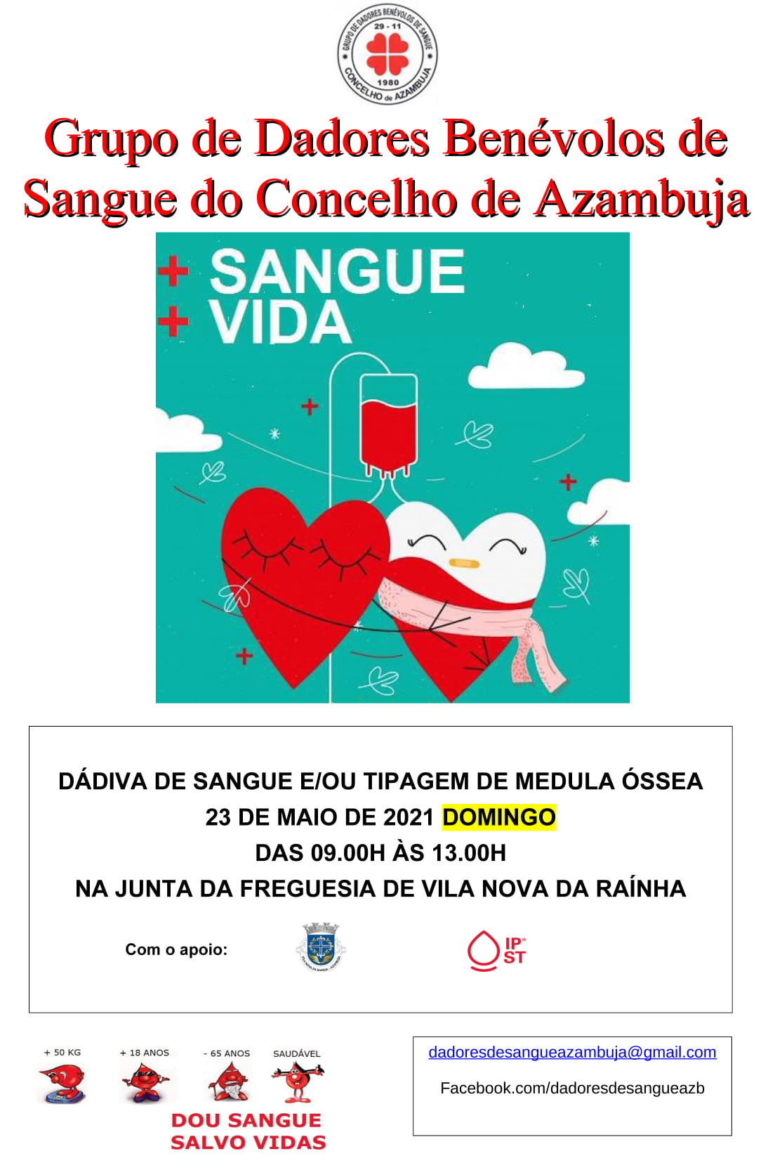 É já no próximo domingo dia 23 de Maio que o Grupo de Dadores Benévolos de Sangue do Concelho de Azambuja, realiza mais uma recolha de sangue e/ou tipagem de medula óssea, desta vez em Vila Nova da Rainha.