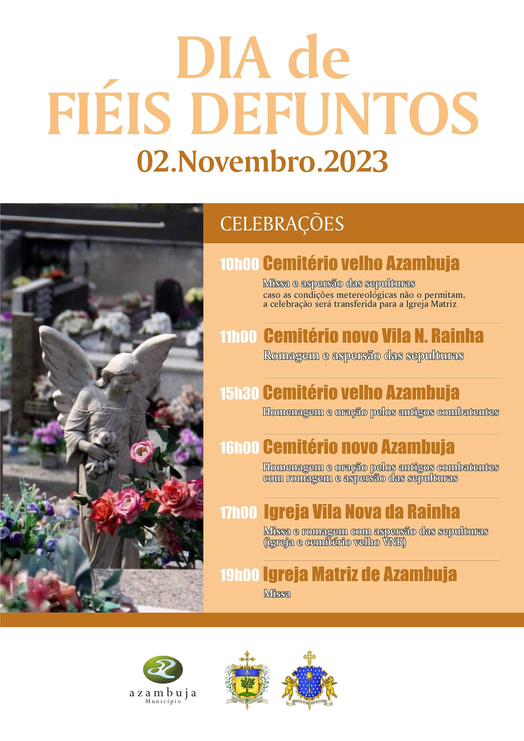 Como é habitual, vão realizar-se, pelas 10h00, a designada “Missa de Finados” e o ato de aspersão das sepulturas, no Cemitério Velho de Azambuja, localizado na Estrada Nacional 3. Refira-se que, caso as condições meteorológicas não o permitam, esta missa será realizada, à mesma hora, na Igreja Matriz de Azambuja.