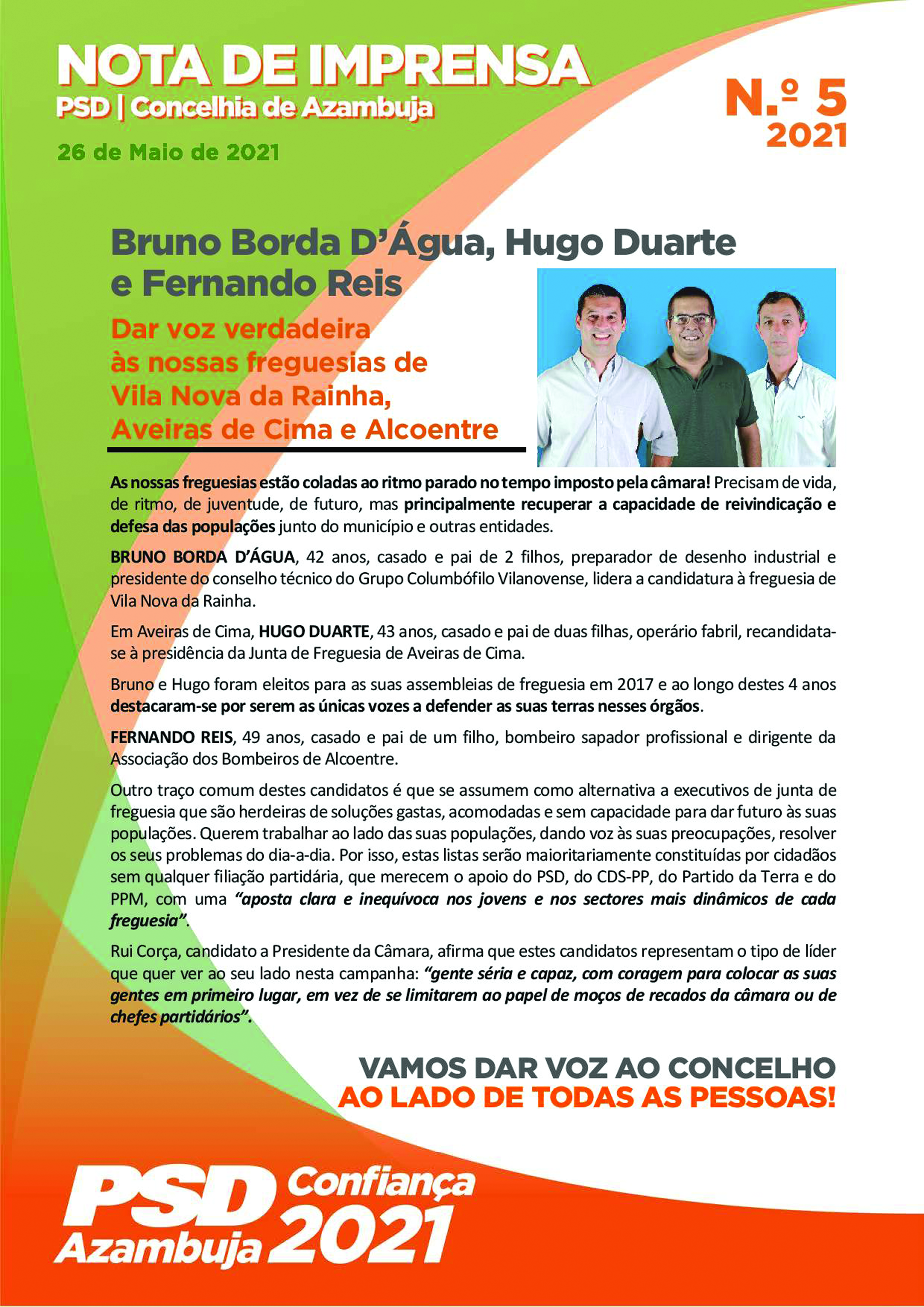 PSD apresenta escolhas Posted on 26/05/202115/10/2021 by admin O PSD/CDS de Azambuja, avançou com os seus candidatos a 3 juntas de freguesia. Saiba mais na nossa edição impressa.