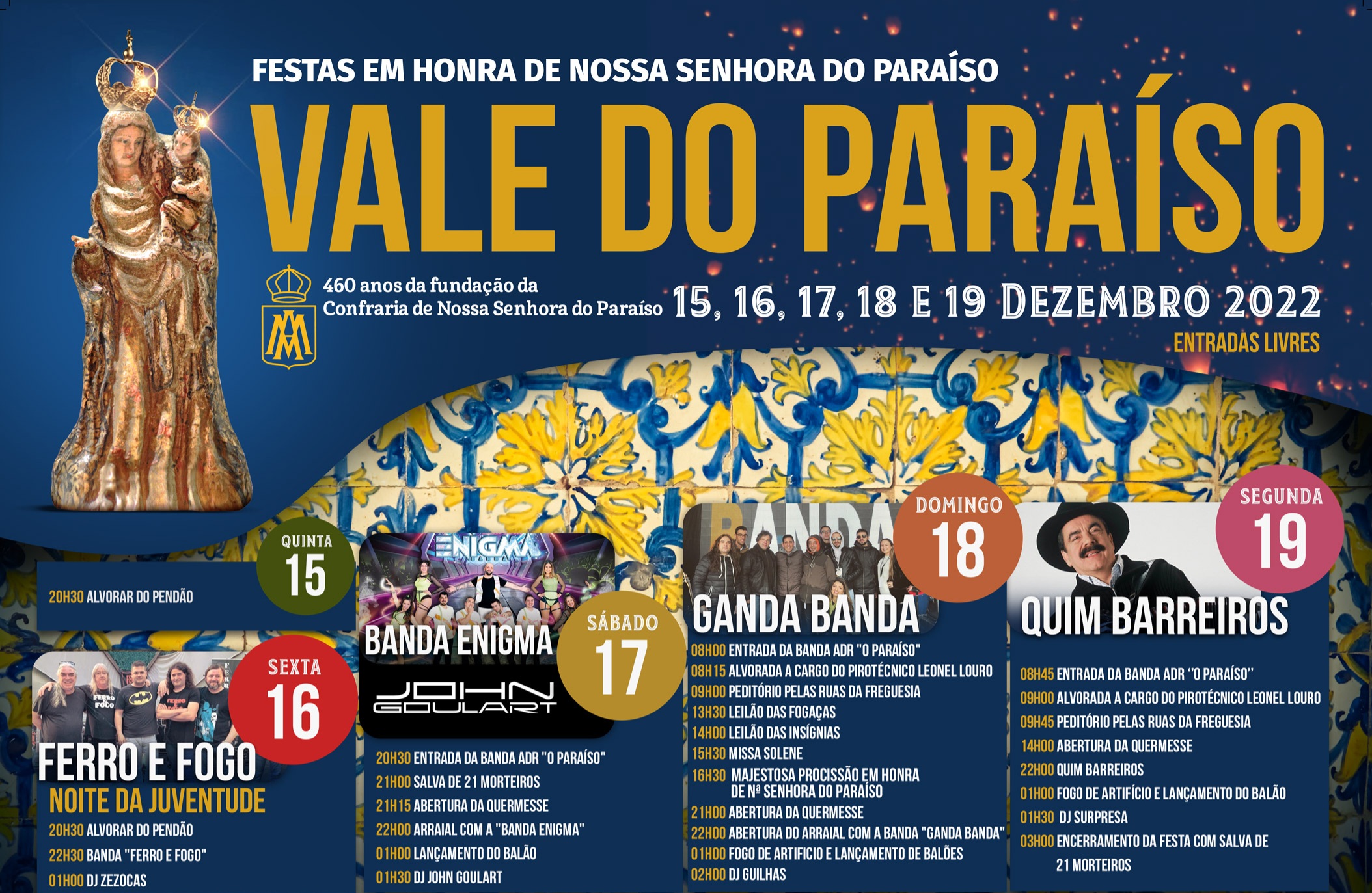 A freguesia de Vale do Paraíso, está a promover os anuais festejos em honra de Nossa Senhora do Paraíso. Neste ano, a festa realiza-se entre os dias 15 e 19 de dezembro, com destaque para a missa e procissão dedicadas à padroeira na tarde de domingo, dia 18.