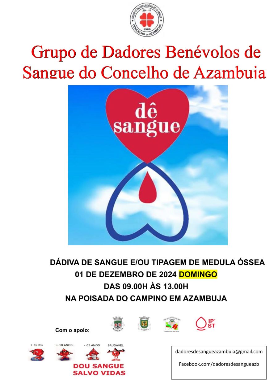 O Grupo de Dadores Benévolos de Sangue do Concelho de Azambuja está a organizar uma campanha de doação de sangue no dia 1 de dezembro na Poisada do Campino em Azambuja. O evento ocorrerá das 9:00 às 13:00, seguindo as diretrizes de saúde.
